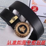 品名:Versace.范思哲原单 材料:百分百头层牛皮,保证真皮。24K纯钢扣双面可用专柜同等质量, 送人自用首选 包装: 请认准如图专柜包装,赠送打孔器,银联发票,宽度3.8Cm