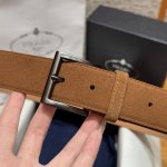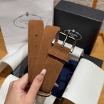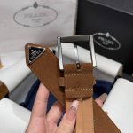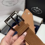 / 普家麂皮腰带 Prada这款绒面牛皮革腰带风格简约而不失精致,末端醒目装饰涂珐琅三角形金属徽标. 宽度3.5Cm.