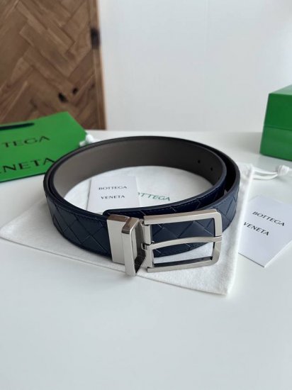 Bv 2025最新款男士编织腰带 双面用 纯手工Intreccio大格子编织 双面意大利小牛皮搭配微复古银色可旋转针扣 皮带宽度35Mm 颜色: 深蓝色柏绿色