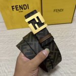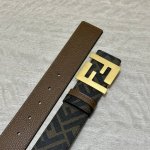 Fendi 芬迪 专柜同款 宽4.0Cm 双环正反用腰带 Ff按钉搭扣 咖啡色Cuoio Romano皮革材质 反面面料带有烟草黄和黑色Ff图案 四方金属饰面 时尚经典 百搭款