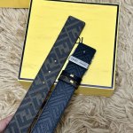 图片包装 Fendi 芬迪 专柜同款 宽4.0Cm 双环正反用腰带 Ff按钉搭扣 深蓝色Cuoio Romano皮革材质 反面面料带有烟草黄和黑色Ff图案 四方