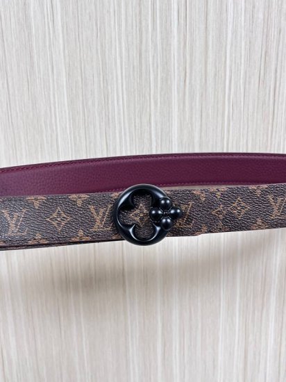 Flowergram 双面腰带选用 Monogram 帆布和 Monogram 压纹皮革演绎两式风尚,以宛若珠宝的柔美搭扣致意 Monogram 花卉,可为各式造型注入典雅风采。,3.0宽酒红荔枝纹圆花烤漆黑扣。