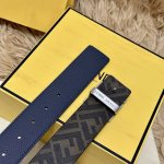 图片包装+10 DDD Fendi 芬迪 专柜同款 宽4.0Cm 双环正反用腰带 Ff按钉搭扣 深兰色Cuoio Romano皮革材质 反面面料带有烟草黄和黑色Ff图案 四方金属饰面 时尚经典 百搭款 DDD