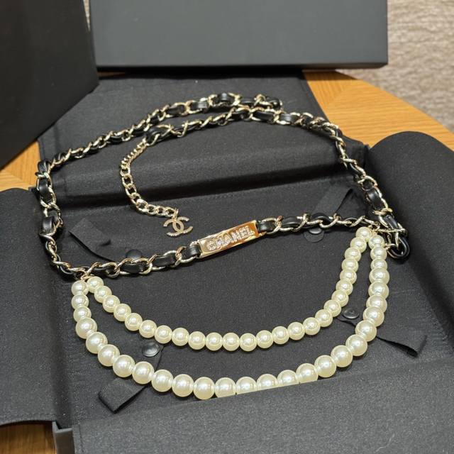 香家新款珍珠腰穿链 DDD 珍珠链与双层编织牛皮设计,做工精致,整体造型大气出众,同时融合众多元素,设计感十足,还可以当项链. DDD