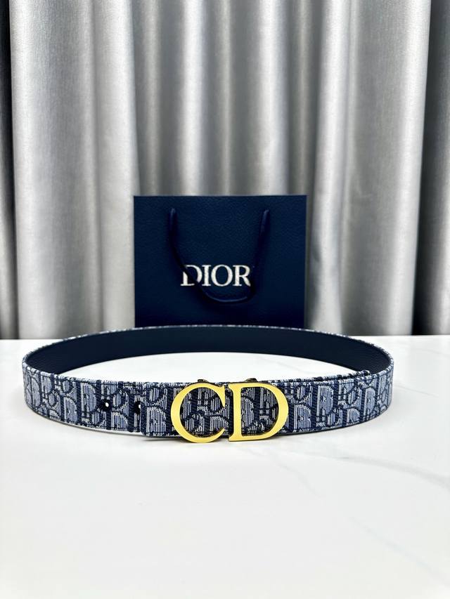 宽度3.5Cm Dior 这款 35 毫米双面腰带兼具典雅气质与摩登风范。双面设计,采用 Oblique 印花面料和牛皮革精心制作,一面为蓝色Oblique印花面料,另一面为粒面牛皮、可搭配各式35毫米腰带不锈钢扣,打造富有个性特色的单品,时尚百搭。 DDD