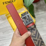/ Fendi 芬迪 专柜同款 宽4.0Cm 双环正反用腰带 Ff按钉搭扣 大红色Cuoio Romano皮革材质 反面面料带有烟草黄和黑色Ff图案 四方满钻金属饰