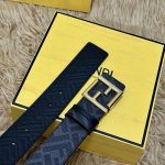Fendi 芬迪 全套包装 专柜同款 宽4.0Cm 双环正反用腰带 Ff按钉搭扣 黑色Cuoio Romano皮革材质 反面面料带有烟草黄和黑色Ff图案 四方金属饰面 时尚经典 百搭款