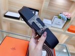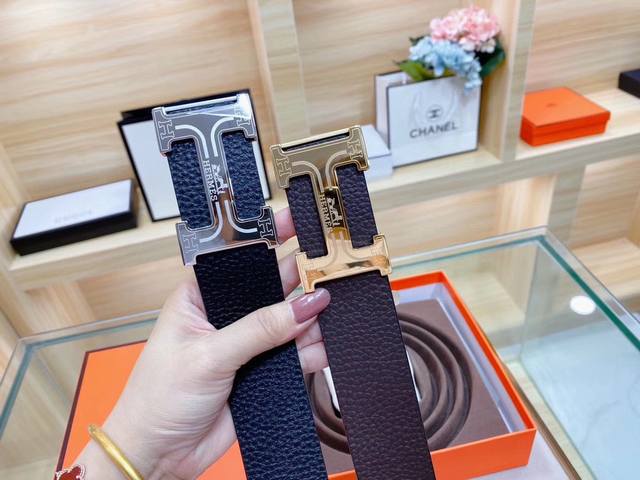 / 爱马仕进口头层荔枝纹牛皮,搭配原单新款18K钢扣扣头,双面可用,一面黑色 一面咖啡 彰显超凡品味,油边近乎完美,原单皮料定制,质感无可挑剔,专柜宽度3.8Cm。