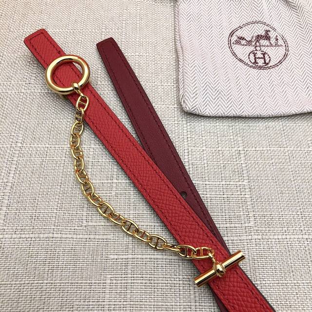 HermèS爱马仕女款皮带 原单品质 进口头层牛皮手掌纹配小牛皮底 双面可用 红酒红 13Mm宽 配链条金 银扣 DDD