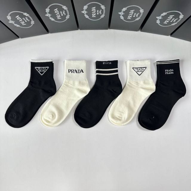 / 特 配专柜包装 prada 普拉达 新款中长款堆堆袜袜子!一盒五双,专柜同步筒袜袜子,大牌出街,潮人必备超好搭