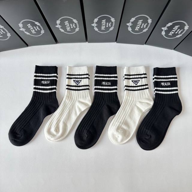 / 特 配包装 prada 普拉达 新款刺绣经典中长款堆堆袜袜子!一盒五双, 专柜同步筒款袜子,大牌出街,潮人必备超好搭。