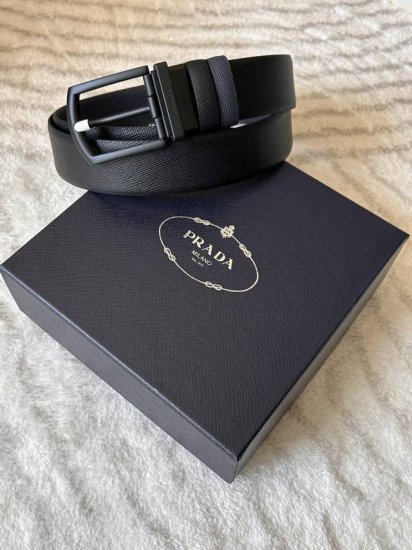 / Rada 普拉达 专柜同款 男士双面用腰带 宽3.4Cm 带身采用双面黑配蓝Saffiano牛皮 搭配简约旋转哑黑针扣,承载着品牌象征性的图案,释放优雅与现代气