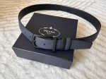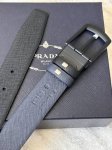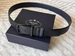 Rada 普拉达 专柜同款 男士双面用腰带 宽3.4Cm 带身采用双面黑配蓝Saffiano牛皮 搭配简约旋转哑黑针扣,承载着品牌象征性的图案,释放优雅与现代气