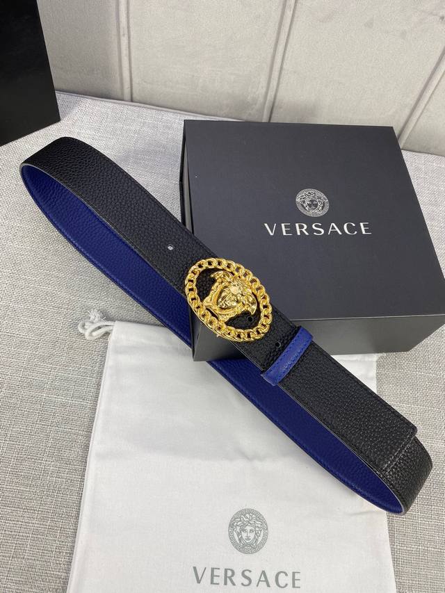 / 宽度:4.0Cm 范思哲 两面荔枝纹腰带饰有标志性的Versace美杜莎头像扣,彰显品牌格调。是一款精美的衣橱必备单品。