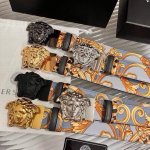 宽度3.8Cm Versace 此款印花底黑色腰带采用小牛皮制成,金色搭扣饰有品牌标志性的美杜莎头像!
